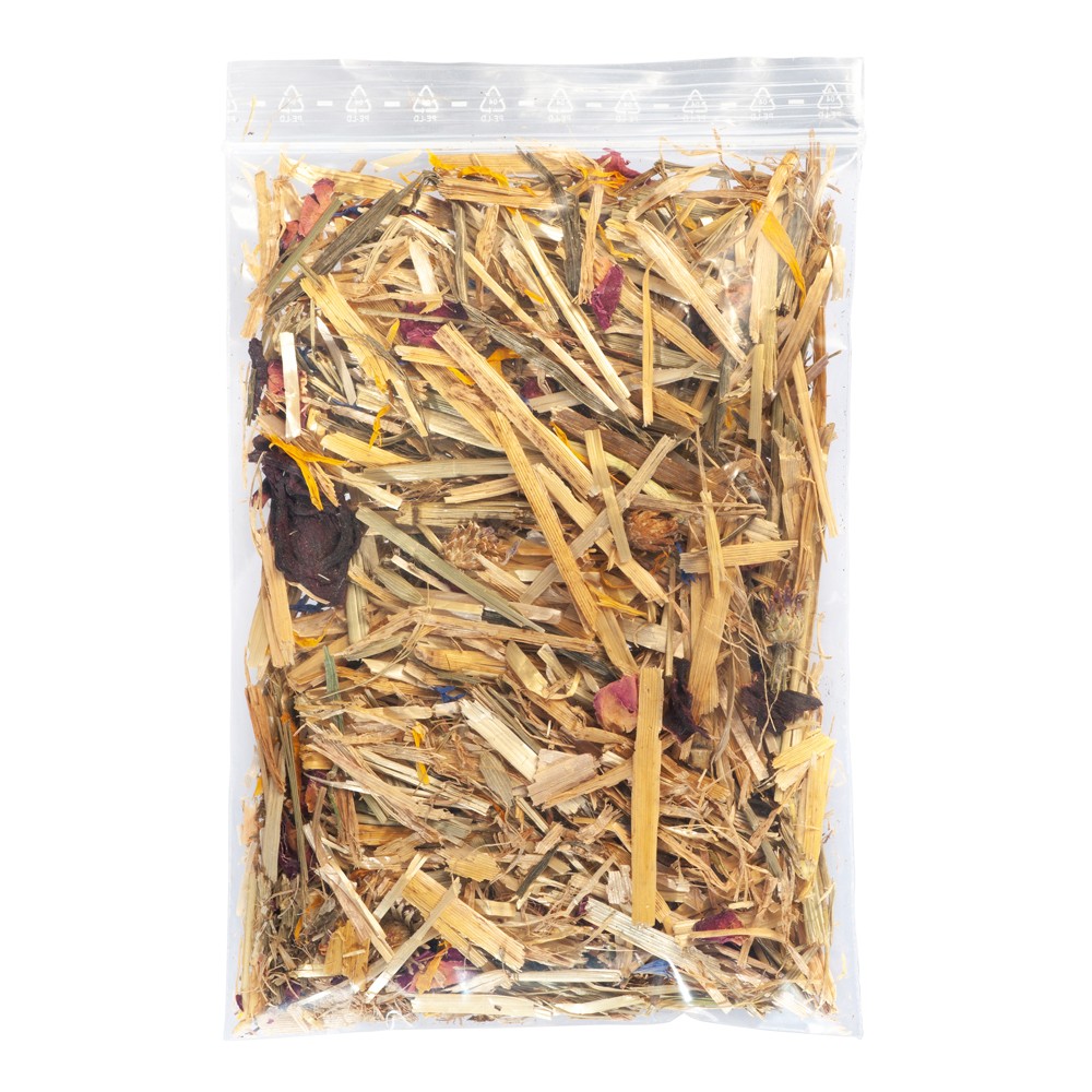 Wiesengräser und -kräuter, Grünhafer, Stroh, Hibiskusblüten, Buschrosenblütenblätter, Kornblumenblüten, Ringelblumenblüten