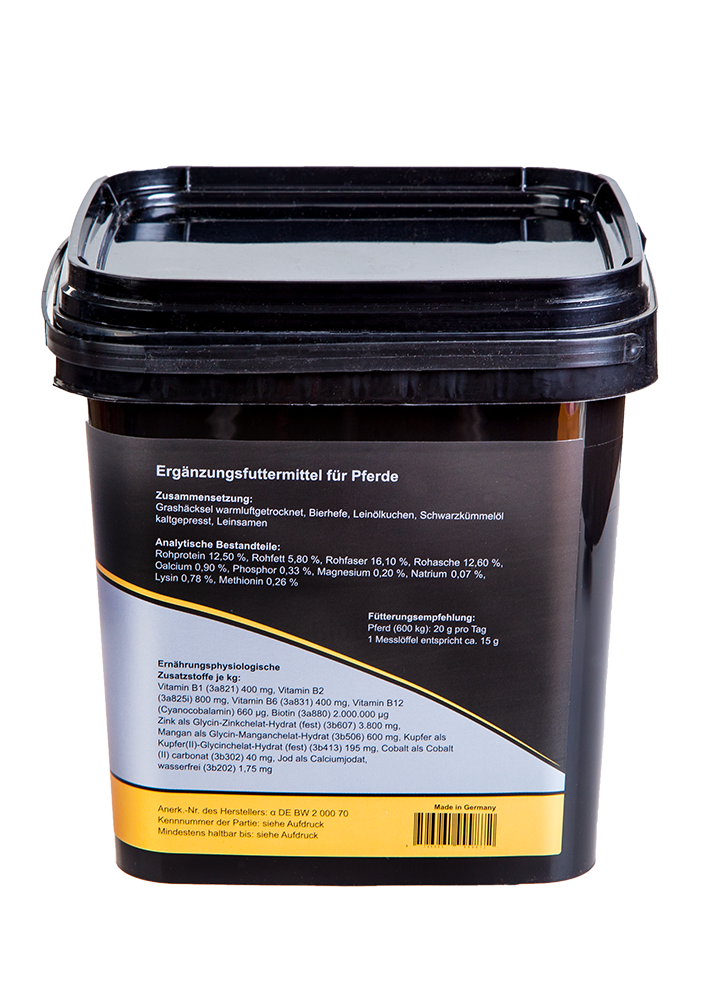 - Unterstützt die Huf-, Haut- und Fellgesundheit