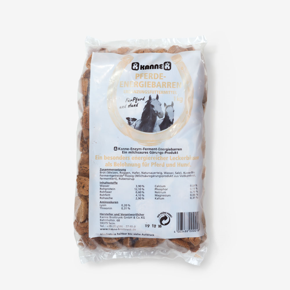 Kanne Enzym-Ferment-Energiebarren sind ein traditionell gebackenes Naturprodukt für Pferde, Hunde und andere Tiere. Im Bäckerofen hergestellt, liefern die Energiebarren wertvolle Energie aus natürlichen Zutaten und dienen gleichzeitig als leckere Belohnung. Dank ihrer hochwertigen Zusammensetzung sind sie gut verträglich und können unbedenklich in größeren Mengen gefüttert werden.