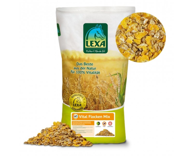 LEXA Vital Flocken-Mix ist ein hochwertiges Kraftfutter, das Pferde zuverlässig mit schnell verfügbarer und leicht verdaulicher Energie versorgt. Die Kombination aus hydrothermisch aufgeschlossenen Mais- und Gerstenflocken sorgt für eine hohe Bekömmlichkeit und optimale Nährstoffaufnahme.