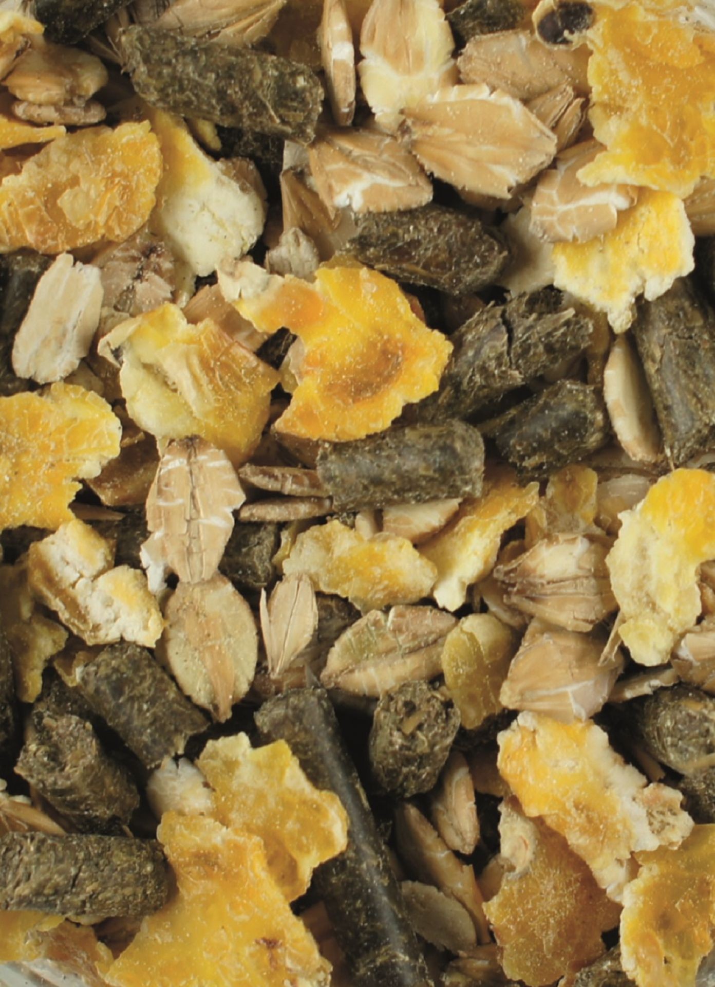 Gerstenflocken (hydrothermisch aufgeschlossen und gewalzt), Maisflocken (hydrothermisch aufgeschlossen und gewalzt), Luzernegrünmehl, Melasseschnitzel, Weizengrießkleie, Haferflocken, Zuckerrübenmelasse, Leinexpeller, Bierhefe, Rapsöl, Monocalciumphosphat, Natriumchlorid, Schwarzkümmel, Algenkalk, Magnesiumoxid, Leinöl, Fenchel, Anis, Knoblauch, Seealgenmehl, Bockshornkleesamen, Eibischwurzel, Kümmel.