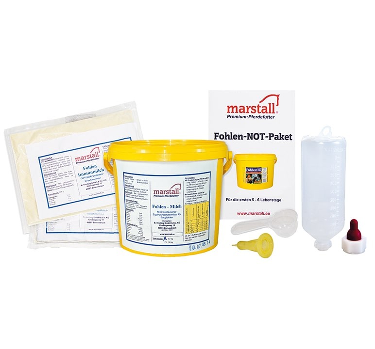 Das Marstall Fohlen-NOT-Paket ist ein Ergänzungsfuttermittel für Saugfohlen und kein Ersatz für tierärztliche Notfallversorgung. Die Bereitstellung des Pakets sollte vorsorglich bei jeder Fohlengeburt eingeplant werden.