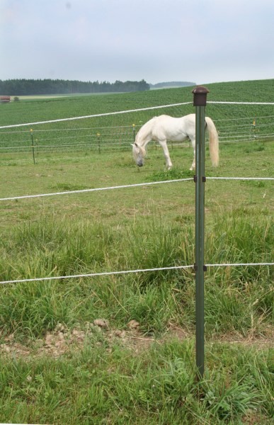 Die charakteristische T-Form sorgt für zusätzliche Stabilität im Boden, während die integrierten Lochungen ein flexibles Anbringen von Isolatoren in verschiedenen Höhen ermöglichen. Der Pfahl ist zudem mit einer hochwertigen Beschichtung gegen Korrosion versehen, wodurch er optimal für den langfristigen Außeneinsatz geeignet ist.