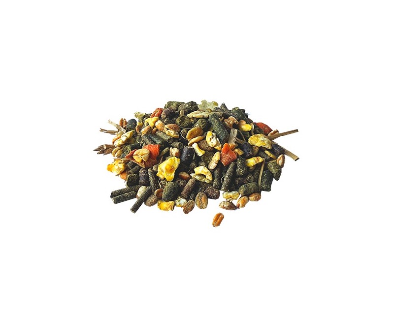 Timothee, Reiskleie, Weizenfutter, Apfelpülpe, Sojaextraktionsschrot (NGMO), gepuffte Gerste, Luzerne, Sojabohnenflocken (NGMO), Sonnenblumenextraktionsschrot, Zuckerrohrmelasse, gepuffter Mais (NGMO), Weizenstroh, Leinsamenöl, Natriumchlorid, Calciumcarbonat, Erbsenflocken, Monocalciumphosphat, Karottenflocken, Magnesiumoxid, Sojaöl (NGMO), Bierhefe